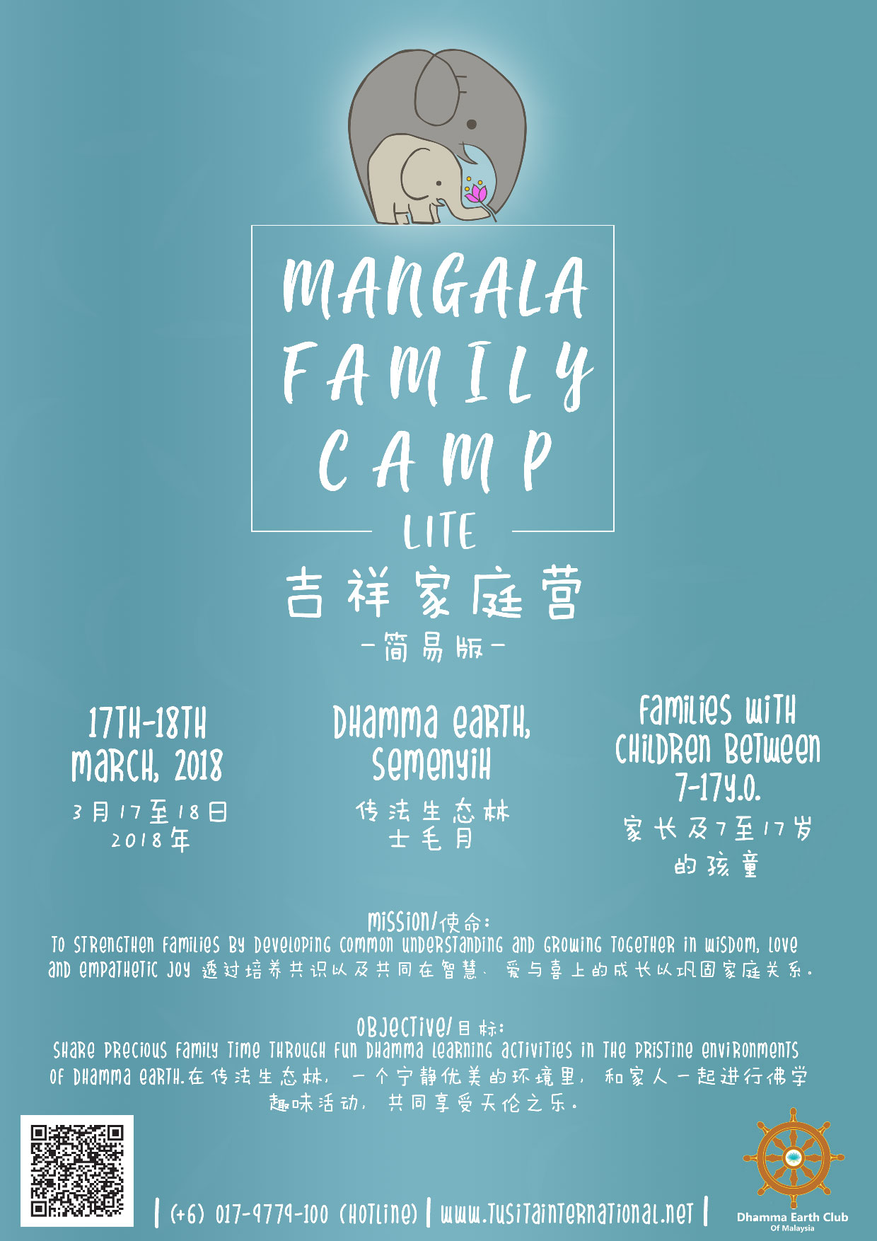 Join us in a relaxing 2-days 1-night (17 – 18 March 2018) family bonding camp. Come with your children and teenagers to learn how to apply Dhamma in daily life through engaging activities, discussions, introduction to meditation and Dhamma talk. Take a break from hectic city life and electronic devices by sharing precious moments of family learning and growth in the natural environments of Dhamma Earth. This camp is limited to 15 families. Hope to see you there!