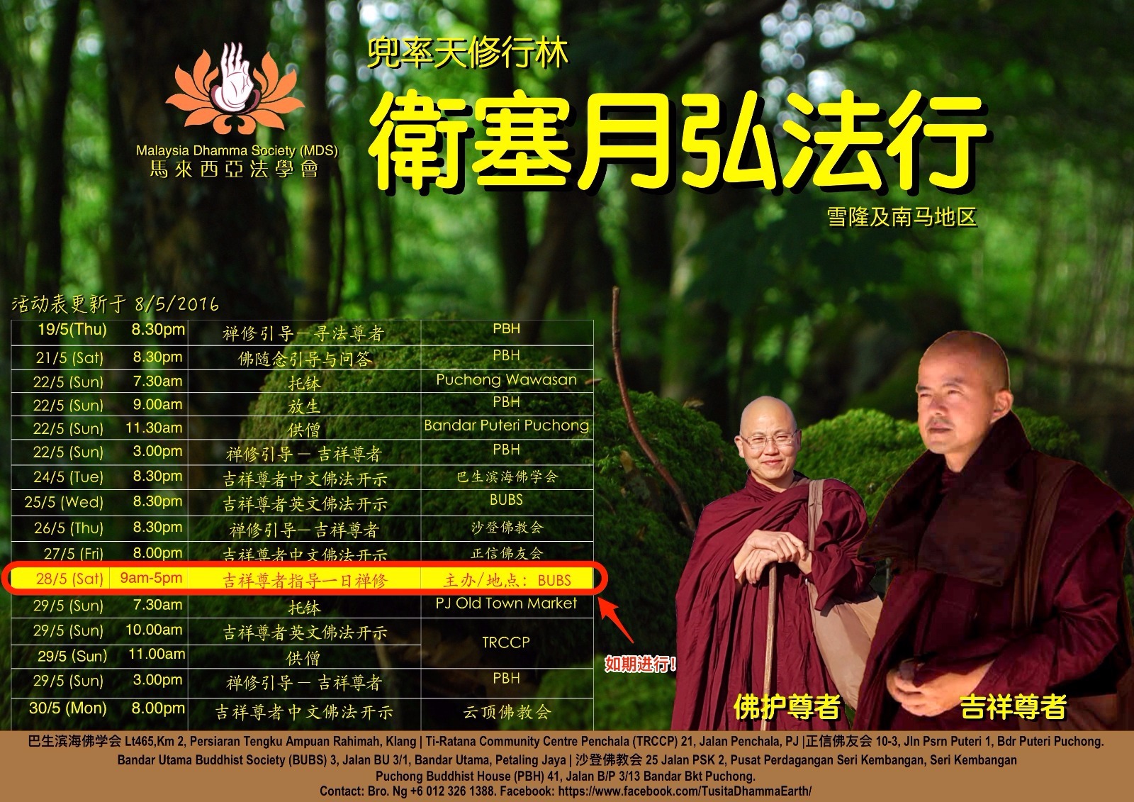 28/5(Sat) 9am-5pm: One day Retreat (Anapanasati) at BUBS*; 7.30am & 11.30am Sangha Dana at BUBS. Kindly click here to register online for the one-day retreat. Please contact Bro Ng for any enquiry.