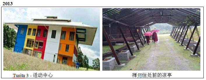 款项的一部分除了用于维持本学会及道场的运作、护持僧团及禅修者得日常生活,其余的大部分皆用于建筑经费。如:位于兜率天2所建设的男出家众住所、禅堂、多用途中心、禅师住处、凉亭;位于兜率天1所建设的长屋亭子;兜率天3的活动中心。这些建筑的增建是为了能容纳更多出家众、禅修者及信众。以下的图片及所示的年份代表兜率天的建设进展。请阅以下的附录,历年的发展简介。