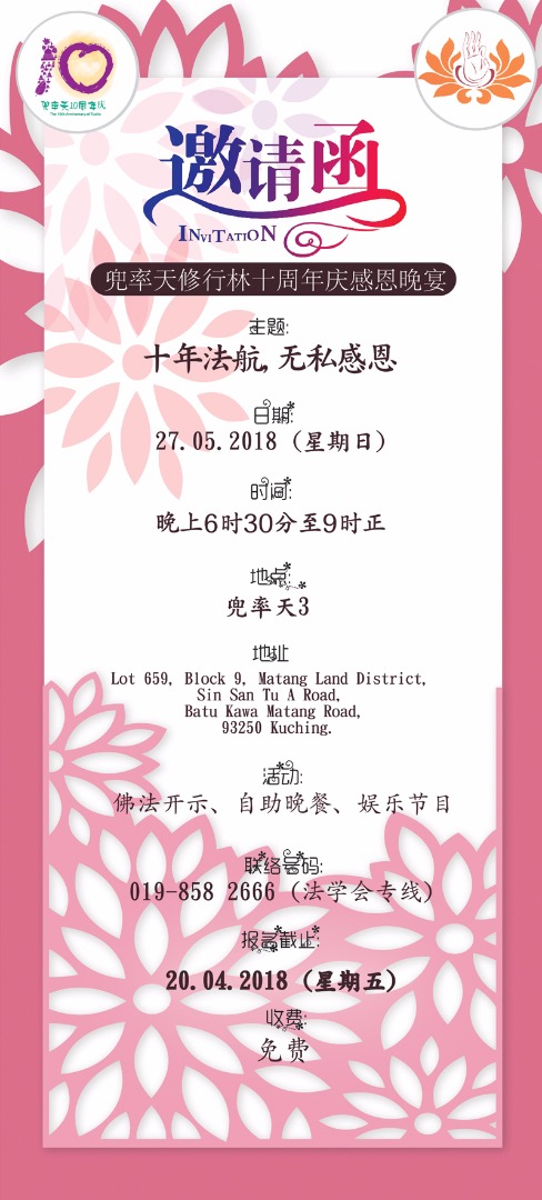 因为正法的延续,让你我凝聚在一起,互相学习与成长。在这学法路上,我们互相扶持,齐力同心。今年,正是兜率天修行林迈入十周年庆的日子。马来西亚法学会为此筹办了十周年庆感恩晚宴,诚邀所有成员与护持者出席共聚一堂!