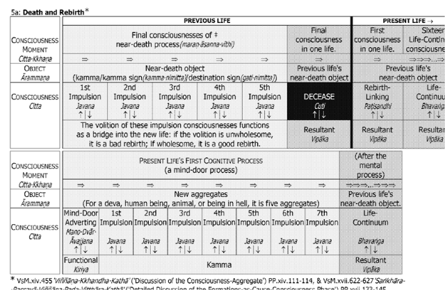 118 rebirth-linking consciousness: this resultant consciousness links the past life with the present. For details, see table ‘Sa: Death and Rebirth’, p.SO.