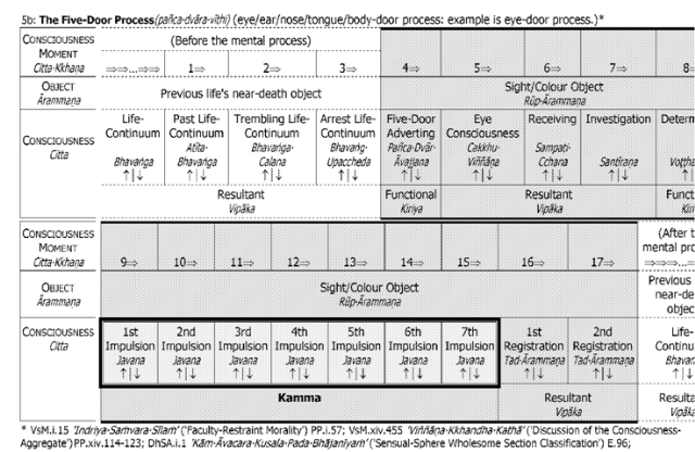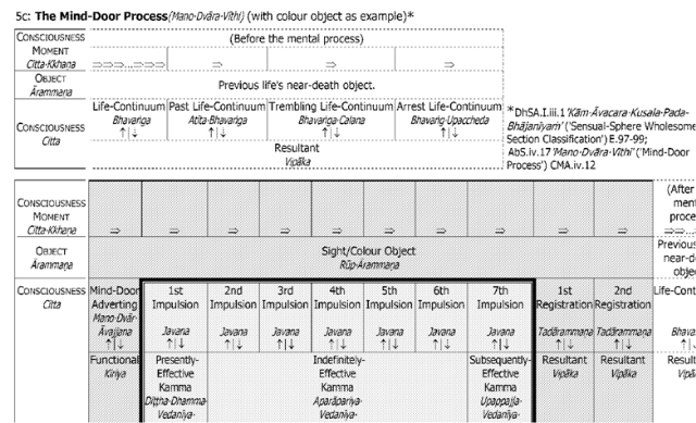 · All five-door processes (eye-, ear-, nose-, tongue-, body door) follow the same procedure, according to the natural law of the mind(dtta·n~ma). Thus, the fivedoor process only ‘picks up’ the object (the eye-door process only cognizes that there is colour), does not yet ‘know’ the object (colour). The ‘knowing’ takes place at the fourth and subsequent mental processes (See table ‘The Mind-Door Process’, p.146). The volition of the impulsion consdousnesses is here only weak, which means the kamma can produce a result only in a future life’s continuanceO>avatti):it cannot produce a rebirth-linking consciousness (pafisandhi·dtta).
