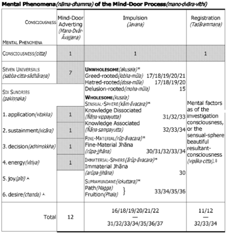 * For the mental phenomena of the unwholesome impulsions, see tables 2a/2b/ 2c, p.46ff, of the sensual-sphere wholesome, tables 3a/3b, p.65ff, the finematerial /immaterial sphere, table 3c, p.83ff, and the supramundane, table 3d, p.331.
