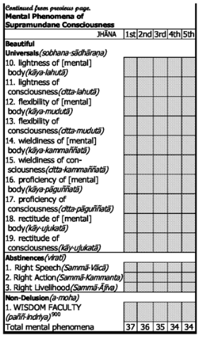 In the same way, The Buddha explains how the remaining aggregates should be regarded with insight knowledge: the aggregate of eleven categories of feeling, and the aggregates of eleven categories of perception, formations, and consci­ousness.8S8 To be able to discern them one needs, of course, to have developed the light of wisdom, which arises with jhana or access concentration.8s9 Other­wise one cannot discern the five aggregates, for they can be discerned only by the wisdom eye(pafifiii-cakkhu). 264