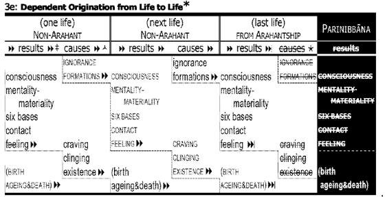 309 The Buddha explains it in, for example, D.ii.2 ‘Maha·Nidana·Suttam’ (‘The Great Causa­tion Sutta’): ‘I have said: “Because of mentality-materiality, there is consciousness(nama’nJ­pa-paccaya vifiiij”Qarh),” and this is the way it should be understood. If consciousness, Ananda, did not obtain establishment in mentality-materiality(nama’f$e-paliltf1arh na labhissatha), would there then be an arising and existence of birth, ageing, death and suffering?’ The Buddha is here referring to the cause of mentality-materiality within one life (see quotation foot­note * under table’3e: Dependent Origination from Life to Life’,p.345): if one goes beyond